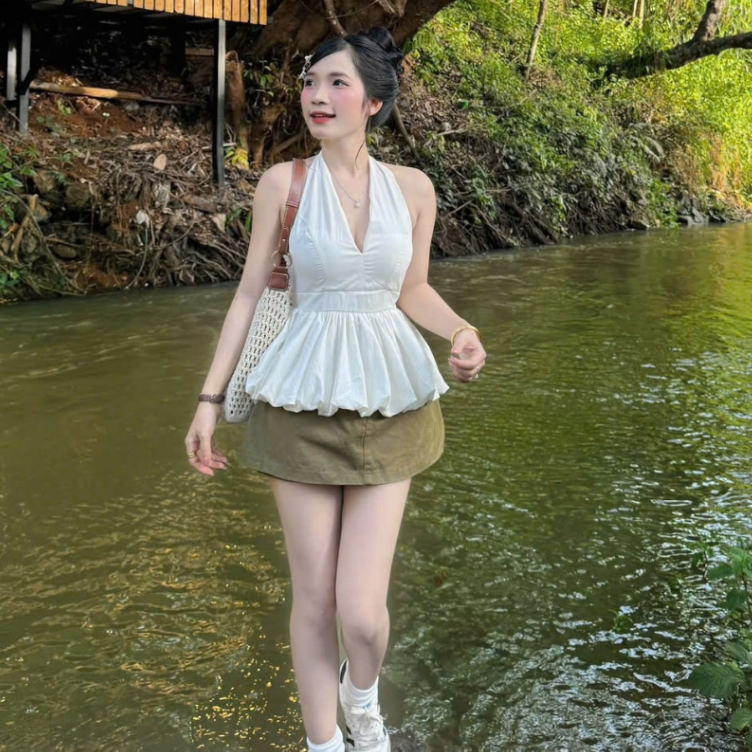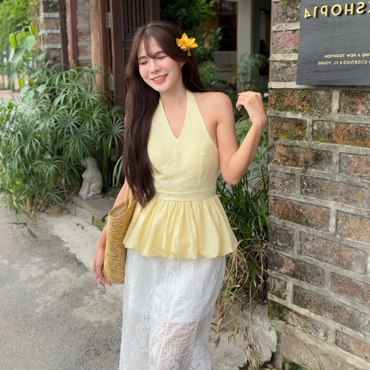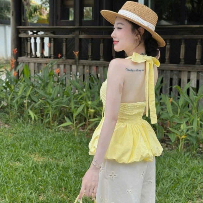✔️ Thiết kế dây buộc nơ cổ kiểu yếm, vạt xòe kiểu bí, phối chun sau lưng ôm tôn dáng