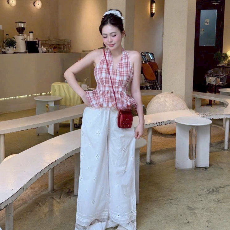 ✔️ Thiết kế dây buộc nơ cổ kiểu yếm, vạt xòe kiểu bí, phối chun sau lưng ôm tôn dáng