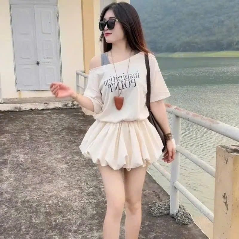 ✔️ Tên sản phẩm: SET 2 ÁO NHÚM EO NỬA TRƯỚC thun cổ tròn phối chữ POINT dáng croptop trễ vai siêu xinh